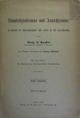 1. Tsd. Deutsche Erstausgabe. Schrift des US-amerikanischer Journalisten und Anarchisten Benjamin Ricketson Tucker (1854 ? 1939) der ein konsequenter Gegner des autoritären Kommunismus und des Staatssozialismus war. Ins Deutsche übertragen von Georg Schumm. Mit einem Anhang: ´Die Literatur des individualistischen Anarchismus´. Umschlag und erste Seite mit Filmoplastklebestreifen. Teilweise unbeschnitten.