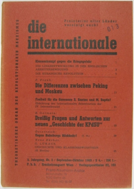 Organ des Internationalen Sekretariats der IV. Internationale. Enthält: Klassenkampf gegen die Kriegsgefahr; Die Linksentwicklung in der englischen Arbeiterbewegung; Die kubanische Revolution; P. Frank - Die Differenzen zwischen Peking und Moskau; Freiheit für die Genossen S. Santen und M. Raptis (Erklärung des Internationalen Sekretariats der IV. Internationale); E. Germain - Dreißig Fragen und Antworten zur neuen Geschichte der KPdSU; Österreich - Gegen Habsburgs Rückkehr (f.m.); R. Merlin - G. Lukacs Geschichte und Klassenbewusstsein. Ehemaliges Archivexemplar, Stempel und Signatur auf Deckel. Altersbedingt gebräunt, sonst guter Zustand.