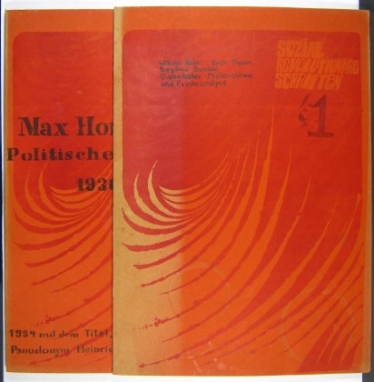 Im Kontext der Studentenbewegung publizierter Raubdruck im orange-roten Einband. Alles Erschienene. Auf dem Umschlag der Horkheimer-Schrift ist vermerkt: ´1934 mit dem Titel ´Dämmerung´ unter dem Pseudonym Heinrich Regius erschienen.´ Bd. 1 vorn mit Wasserrändern und stellenweise lichtrandig. Sonst guter Zustand.