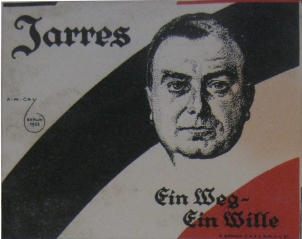 Die DVP war eine nationalliberale Partei der Weimarer Republik. Zu ihren bekannten Mitgliedern gehörten der Außenminister Gustav Stresemann und Julius Curtius. Zwischen 1920 und 1931 (Ausnahme: 1920/1921) war sie in den Weimarer Reichsregierungen vertreten. Die DNVP war eine rechtskonservative Partei in der Weimarer Republik. Ihre Programmatik beinhaltete Nationalismus, Nationalliberalismus, Antisemitismus, kaiserlich-monarchistischen Konservatismus sowie völkische Elemente. Bei der Reichspräsidentenwahl 1925 gründeten beide mit der Wirtschaftspartei den sog Reichsblock, der den Duisburger Oberbürgermeister und ehemaligen Reichsinnenminister Karl Jarres (DVP) unterstützte. Beim zweiten Wahlgang rief der Reichsblock zur Wahl von Paul von Hindenburg zum Reichspräsidenten auf, der schließlich die Wahl gewann. Titel der Klebezettel: Rettet Deutschland vor dem Untergang wählt deutschnational; Deutsche Volkspartei löscht alles auch jeden Bolschewistenbrand; Rette dein Preußen wähle die deutschnationale Liste; Jarres ein Weg ein Wille; Jarres der Kandidat der Schwerindustrie; Der Retter. Guter Zustand.