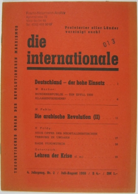 Organ des Internationalen Sekretariats der IV. Internationale. Enthält: Deutschland der hohe Einsatz; W. Becker - Bundesrepublik Ein Idyll des Klassenfriedens; M. Pablo - Die arabische Revolution (II); N. Toldy - Neue Opfer des Neostalinistischen Terrors in Ungarn; Rade Vujowitsch; Österreich - Lehren der Krise (f.m.). Ehemaliges Archivexemplar, Stempel und Signatur auf Deckel. Altersbedingt gebräunt, sonst guter Zustand.