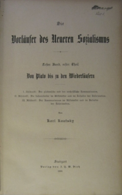 2 Teile in einem Band: Die Geschichte des Sozialismus in Einzeldarstellungen. Erster Band, erster Theil. Die Vorläufen des Neueren Sozialismus. Erster Theil. Von Plato bis zu den Wiederläufern. + zweiter Theil: Von Thomas More bis zum Vorabend der französischen Revolution.