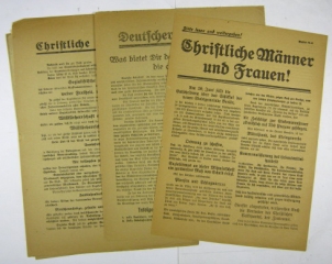 Konvolut bestehend aus fünf Flugblättern des Zentrums zur Wahl zur Verfassungsgebenden Nationalversammlung, Kommunalpolitik, Kommunalwahlen in Berlin usw. Im Aufruf des Reichsausschusses der Zentrumspartei wird sich zu den Ereignissen und Folgewirkungen der Novemberrevolution positioniert: ´Durch gewaltsamen Umsturz ist die alte Ordnung Deutschlands zerstört, sind die bisherigen Träger der Staatsgewalt teils beseitigt, teils lahmgelegt worden. Eine neue Ordnung ist auf dem Boden der gegebenen Tatsachen zu schaffen, diese Ordnung darf nach dem Sturz der Monarchie nicht die Form der sozialistischen Republik erhalten, sondern muß eine demokratische Republik werden.´ Teilweise mit kleineren Rissen, altersbedingt leicht gebräunt. Guter Zustand.