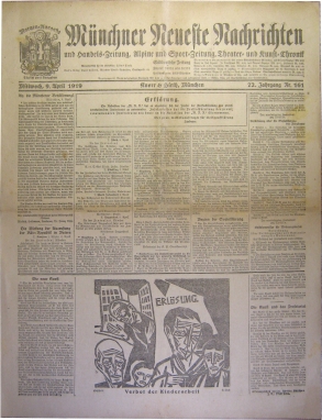 Titelblatt mit Holzschnitt von Wachlmayer (´Verbot der Kinderarbeit´). - Der Expressionist Alois Wachlmayer war an der Errichtung der Münchner Räterepublik beteiligt. Seine Holzschnitte wurden in maßgeblichen Organen der deutschen Avantgarde publiziert, so beispielsweise in vier Heften des ´Sturm´. In der ersten Mappe des zweiten Jahrgangs der ´Schaffenden´ erschien die Radierung ´Blick auf eine Straße´. Schon früh pflegte er Kontakt zur Münchner Künstlerszene um den ´Blauen Reiter´. Schließlich wurde Wachlmayer Mitglied im Aktionsausschuß revolutionärer Künstler Münchens, gestaltete zusammen mit Fritz Schaefler die Titelblätter der ´Süddeutschen Freiheit´ u. arbeitete an der Münchener links-expressionistischen Monatsschrift ´Der Weg´ mit. In den ´Münchener Neusten Nachrichten´ u. im ´Bayrischen Kurier´ veröffentlichte er agitatorische Holzschnitte - ein avantgardistisches Novum in der Geschichte der beiden Blätter. Des Weiteren mit einer Erklärung Gustav Landauers (1870 - 1919) zur Übernahme der Redaktion der Münchner Neuesten Nachrichten durch den provisorischen revolutionären Zentralrat. Enthält auch eine Erklärung des provisorischen revolutionären Zentralrats gegen Antisemitismus unterzeichnet von Ernst Niekisch, Fritz Soldmann, Gustav Landauer und Franz Lipp. Ebenso mit einem Artikel `Die neue Kunst? von Ludwig Coellen. - Exemplar mit Knickfalte, eine Knickfalte z.T. geklebt, insgesamt guter Zustand.