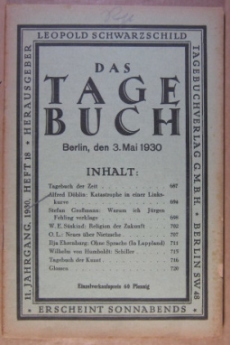 Herausgeber Leopold Schwarzschild. Enthält u.a.: Alfred Döblin: Katastrophe in einer Linkskurve. W.E. Süskind: Religion der Zukunft. Ilja Ehrenburg: Ohne Sprache (In Lappland). Umschlag lichtrandig. Einige wenige Anstr.