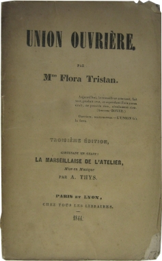 Dritte Auflage. - Die 1803 geborene Flora Tristan (eigentlich: Flora Célestine Thérèse Henriette Tristan Moscoso) war eine - auch zeitgenössisch - bekannte Schriftstellerin, (Früh-)Sozialistin und Frauenrechtlerin. Tristan wurde am 7. April 1803 in Paris als Tochter einer Französin und eines peruanischen Adeligen geboren. Sie wuchs in einem als schlossartig beschriebenen Anwesen auf. Tristan beschäftigte sich u.a. publizistisch mit den ´Schattenseiten´ des ökonomischen Aufstiegs und des rasanten Industrialisierungsschubs in England. In ihrem Werk ´Im Dickicht von London oder die Aristokratie und die Proletarier Englands´ (1840) reflektiert sie ihre Erfahrungen im englischen Ballungszentrum und anderen Industriestädten der Insel. Sie problematisiert die (Arbeits-)Situation in den Fabrikanlagen, in den Ghettos sozial Ausgestoßener, in den Zwangsanstalten für Delinquenten und den Stätten der Prostitution. - In ihrem hier vorliegenden 1843 erschienenen Hauptwerk, Union Ouvrière (Arbeiterunion), schliesst sie an ihre vormaligen Ausführungen an. Sie propagiert emphatisch den Zusammenschluss aller Arbeiterinnen und Arbeiter und appelliert, gemeinsam für die eigenen Rechte als Unterprivilegierte in den Kampf zu treten. Besonderes Augenmerk legt sie dabei auf das Recht auf Ausbildung - auch und ganz besonders jenes der Frauen. Tristan bereiste von Ende 1843 bis tief in das Jahr 1844 hinein ruhelos Frankreich, um in einer Vielzahl von Vorträgen ihre Thesen publikumswirksam in Szene zu setzen. In diesen äußert sie ihre Überzeugung, dass sich die arbeitende Bevölkerung organisieren muss, damit sich deren materielle Lebenswirklichkeit (grundlegend) verbessern kann. - Aufgrund ihrer publizistischen Einwürfe und umfangreichen Reiseaktivität war sie einem permanenten Repressions- und Überwachungsdruck ausgesetzt. Die kontinuierlichen Strapazen, die mit ihrem schriftstellerischen und politischen Engagement verbunden waren, führten zu einer wesentlichen Verschlechterung ihres Gesundheitszustands. Eine Typhus-Erkrankung forderte ihren Tribut. Tristan verstarb während der Vortragsreise im Alter von 41 Jahren am 14. November 1844 in Bordeaux. - Der Band enthält neben den Vorworten der ersten und zweiten Auflage die Auseinandersetzungen Tristans über die Unzulänglichkeiten der Hilfsangebote für die subalternen Klassen sowie die Wege und Mittel einer stabilen Etablierung als Arbeiterklasse. Des Weiteren legt sie ein organisatorisches Muster einer Arbeiterunion vor, die als Instrument dienen soll, sich gegenüber der Bourgeoisie behaupten zu können. Der Tristan-Band schließt mit der ´La Marseillaise de l´union ouvriere´ und einem Projekt-Entwurf für eine wöchentliche Publikation unter dem Titel ´Arbeiterunion´ ab. - Exemplar ungeschnitten, Umschlag mit zwei Eckausrissen, stellenweise stark gebräunt, am Falz knickspurig. - Äußerst rare Schrift!