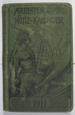 Sozialdemokratischer Kalender mit einigen zeitgenöss. Einträgen. U.a. mit einer Übersicht über die organisatorische und Mitgliederentwicklung der verschiedenen Richtungsgewerkschaften im Jahre 1909. Einband etwas berieben und am oberen Kapital mit kleinem Einriss. Einige wenige Innenseiten entfernt.