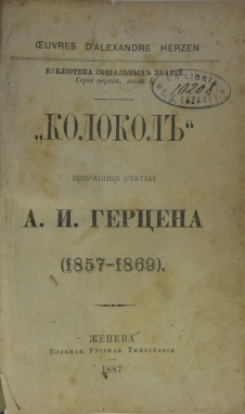 Mit einem Vorwort und unter der Redaktion von L.A.- Tichomirow. Ausgabe der ?Gruppe zur Verbreitung des Sozialwissens?. ?Kolokol? - erste russische revolutionäre Zeitung, die von A.I. Herzen und N.P. Oganjow im Ausland herausgegeben wurde (auf russisch und französisch, von 1857-1865 in London und von 1865-1867 in Genf). Das Buch umfasst eine Auswahl von Artikeln aus ?Kolokol? von A.I. Herzen. Diese Ausgabe wurde in dem ?Gesamtkatalog der russischen illegalen und verbotenen Drucke (Bücher und Periodika)? aufgenommen. Moskau; 1971; Nr. 356. Sehr selten!