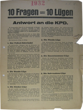 Doppelseitige SPD-Reaktion auf ein KPD-Wahlkampfflugblatt zur Preußen-Wahl im April 1932, in dem gegen die Notverordnungsdiktatur Severings agitiert wird. Die SPD-Preußen kontert in dieser Replik. Die Kommunisten werden dabei als ´Helfer und Förderer des Faschismus´ bezichtigt, ´weil sie die Republik stürzen wollen, um zunächst einmal den Faschismus an Ruder zu bringen.´ Exemplar gestempelt, gelocht und mit kleinem Einriss, guter Zustand.