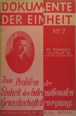 Nicht bei Goldbeck. (= Dokumente der Einheit, Nummer 2). Sammlung von Referaten und Reden des Vorsitzenden der russischen Gewerkschaften Tomsky (1880-1936) aus dem Jahr 1925 zu Fragen der Bildung einer gewerkschaftlichen Einheitsfront:´Wir wissen, daß der Weg zur Einheit mit großen Hindernissen verbunden ist. Wir vergessen nicht eine Minute jene Schwierigkeiten, die die Arbeiterklasse noch oft genug in ihrem Kampf um die Lösung dieser gewaltigen Aufgabe zu begegnen ist. Aber das sie auszeichnende Streben zu diesem Ziel und die Kampfbereitschaft für dieses ist der Unterpfand ihres endgültigen Sieges. Die Idee der Einheit dringt in die Tiefe, in die Arbeitermassen. Sie wird eine populäre Idee, denn der Nutzen der internationalen Einheit der Gewerkschaftsmitglieder ist für jeden Arbeiter klar. Hierin liegt das Unterpfand des Erfolges.´ Tomski nahm sich 1936 aufgrund der stalinistischen Denunziationen selbst das Leben. Er wurde posthum wegen Hochverrats und anderer Delikte im dritten großen Schauprozess von 1938 gegen Bucharin, Rykow u.a. verurteilt und zum ´Volksfeind´ erklärt. Des weiteren ist ein offizieller Briefwechsel des WZSPS und dem IGB abgedruckt. Umschlaggestaltung von Winkler. Besitzstempel auf Titelseite.