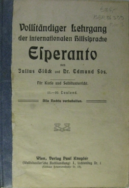 4. Aufl. 11. - 20. Tsd. Verfasst wurde Lehrgang von den Esperantisten Julius Glück (1877 ? 1942) und Edmund Sós (1863 ? 1931). - Privat eingebundene Broschüre, innen im guten Zustand.