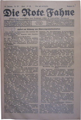 Nach der Machtübertragung an die Nazis und ohne Impressum erschienene Ausgabe des ZO der KPD. Mit dem ´Aufruf zur Bildung von Klassengewerkschaften´ des ZK der KPD als Aufmacher. ´Der ADBG ist tot. Die vom Reformismus geführten Klassengewerkschaften der deutschen Arbeiter sind in der ´Deutschen Arbeitsfront´ ein Teil des faschistischen Staatsapparates geworden. Sie haben aufgehört, als selbständige Organisationen zu existieren. Der ganze Verwaltungsapparat wurde mit zuverlässigen faschistischen Kapitalsknechten besetzt [...] Aber es gibt noch eine revolutionäre, von Kapital und Faschismus unabhängige Gewerkschaftsbewegung: das sind die RGO-Gruppen und roten Verbände!´ Rückseite mit dem Beitrag ´Nazi-Fahrpreiserhöhung bei der BVG!´ Darin heißt es u.a.: ´BVG-Kollegen! Kämpft verstärkt weiter um die zwei Pfennig Lohn, die Euch Papen geraubt hat [...] Verstärkt den Kampf gegen die NSBO, die keine einzige ihrer Versprechungen hält, sondern sich als Betriebspolizei des Bankkapitals betätigt.´ Des Weiteren mit einer Liste von namentlich aufgeführten, ausgeschlossenen ehemaligen KPD-Mitgliedern. - Titelseite mit dem Bibliotheksstempel des Reichsgerichts während des NS. Expl. am Falz verstärkt und mit leichten Kleberesten. - Sehr rar! - Seywald 862.