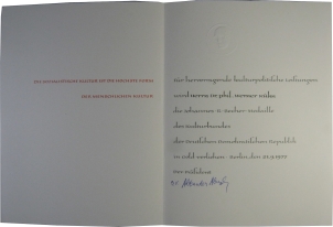 Urkunde zur Verleihung der Johannes R. Becher Medaille des Deutschen Kulturbundes in Gold an Dr. Werner Kühn mit eigenhändiger Unterschrift von Alexander Abusch. (Berlin, den 21.09.1977)
