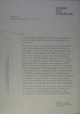 7 Briefe. [6 Briefe an Werner Kühn und 1 Brief an Traudl Kühn] [Absender: Freier Deutscher Gewerkschaftsbund FDGB, Zentralhaus für Kulturarbeit, DEFA, SED (Bezirk Karl-Marx-Stadt)]