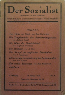 (Seywald 953) Die von Rudolf Breitscheid herausgegebene USPD-Zeitschrift erschien von 1918 bis 1922. Enthält u.a. Texte von Karl Korsch (Die sofortige Sozialisierung des Außenhandels), Georg Tschitscherin (Sowjetrußland und Polen), L. Martow (Diktatur und Demokratie), Leo Kurt Menter (Proletariat und Expressionismus), Eugen Prager (Der Kampf um die Sozialisierung), L. Martow (Der Weltbolschewismus), Max Adler (Die Dialektik bei Engels), Felix Fechenbach (Die bayerische Ordnungszelle). Umschläge z.T. lose.