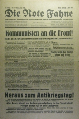 Aufruf zum Antikriegstag, Artikel über die Aufrüstung der SA, zur Rede Thälmanns in Breslau. Mit einer Karikatur von Beier-Red. Am Falz eingerissen, sonst guter Zustand.