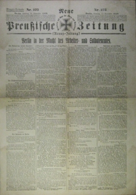 Reaktionäres, monarchistisches Massenblatt, welches dem Westarp-Flügel der DNVP nahestand, mit dem Aufmacher ´Berlin in der Macht des Arbeiter- und Soldatenrates´. Enthält (unkommentiert) Aufrufe und Notizen aus den Reihen des A.-S.-Rats. - Expl. an den Knickfalten etwas gebräunt und minimal rissig. Titelseite mit Fleck und Schriftzug.