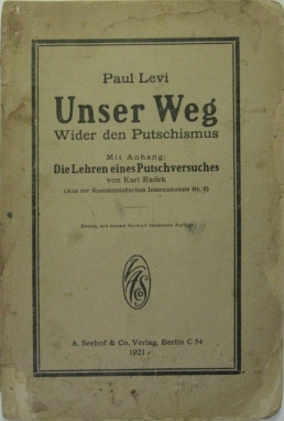 Zweite, mit einem neuen Vorwort versehene Auflage. Broschüre des ehemaligen KPD-Vorsitzenden, welche unmittelbar nach den Märzkämpfen 1921 erschienen war. Darin rechnet Levi mit den proletarischen Aufstandsversuchen im Frühjahr 1921 kategorisch ab: ´Durch das alles wird die Märzbewegung als das charakterisiert, was sie ist: der grösste Bakunisten-Putsch der bisherigen Geschichte.´ - Randrissig und fleckig, Titelblatt mit Namenszug, Text mit Anstreichungen.