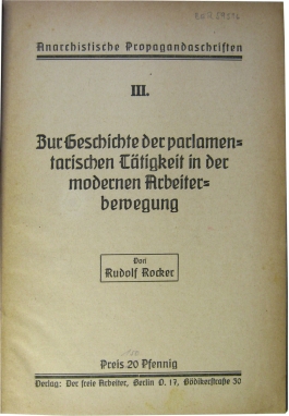 (= Anarchistische Propagandaschriften, Nr. III). (Becker 1999, S. 626; Bock, S. 324; Burazerovic 1177). Rudolf Rockers Absage an den Parlamentarismus marxistischer Observanz. Erschienen in einer, von der Föderation Kommunistischer Anarchisten Deutschlands hg. Zeitschrift ´Der Freie Arbeiter´ angegliederten Schriftenreihe. In der vorliegenden Form von privat neu eingebunden und mit handschriftlichem Titelaufkleber versehen. Einige farbige Anstr. im Innenteil.