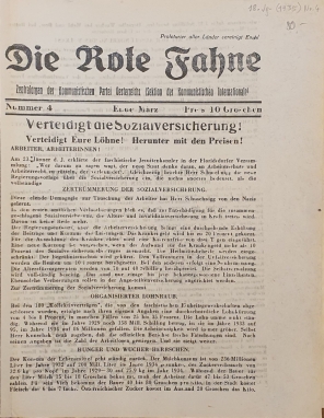 Die Rote Fahne als Zentralorgan der Kommunistischen Partei Österreichs löste von 1919-1939 den 1918/19 publizierten Weckruf bzw. die 1919 erschienene Soziale Revolution als Zentralorgan der Kommunistischen Partei Deutschösterreichs ab. Die Rote Fahne erschien bis Mitte 1933 täglich, 1934 gar nicht und ab 1935 in unregelmäßigen Abständen. - Die hier vorliegende Nummer 4 von Ende März ist laut dem ANNO Historische Zeitungen und Zeitschriften der ÖNB aus dem 17. Jahrgang von 1935. Die handschriftl. Angabe ´18. Jg.´ in Blei stimmt damit wahrscheinlich nicht. Diese Nummer steht unter dem Thema ´Verteidigt die Sozialversicherung! Verteidigt Eure Löhne! Herunter mit den Preisen!´ - Lichtrandig u. schwach berieben, an oberer Kante minimale Randläsuren. Sehr gut erhalten!  Steiner, Gesch. öst. Arb.bew. Bd. 2, 2274