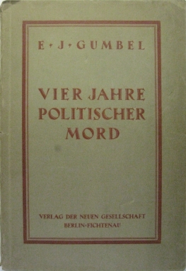 Fünfte Auflage von Zwei Jahre Mord (13. bis 18. Tsd.). Bekanntestes Buch des politischen Publizisten und Pazifisten Emil Julius Gumbel (1891 ? 1966). Durch vergleichende Analyse der statistischen Erhebungen wies Gumbel die politische Rechtslastigkeit der Justiz in Deutschland nach. In der Endphase der Weimarer Republik wurde er massiv angegriffen. So kam es 1930/31 an der Universität Heidelberg zu den sog. Gumbelkrawallen. 1932 wurde ihm die Lehrberechtigung entzogen. 1933 floh er ins Exil nach Frankreich und ab 1940 in die USA. - Rücken am Kopf und Fuss aufgeplatzt, innen am Gelenk gebrochen.