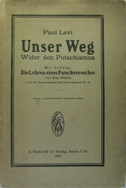 Zweite, mit einem neuen Vorwort versehene Auflage. Broschüre des ehemaligen KPD-Vorsitzenden, welche unmittelbar nach den Märzkämpfen 1921 erschienen war. Darin rechnet Levi mit den proletarischen Aufstandsversuchen im Frühjahr 1921 kategorisch ab: ´Durch das alles wird die Märzbewegung als das charakterisiert, was sie ist: der grösste Bakunisten-Putsch der bisherigen Geschichte.´ - Rücken bestoßen, Deckel knickspurig, Text mit Anstreichungen.